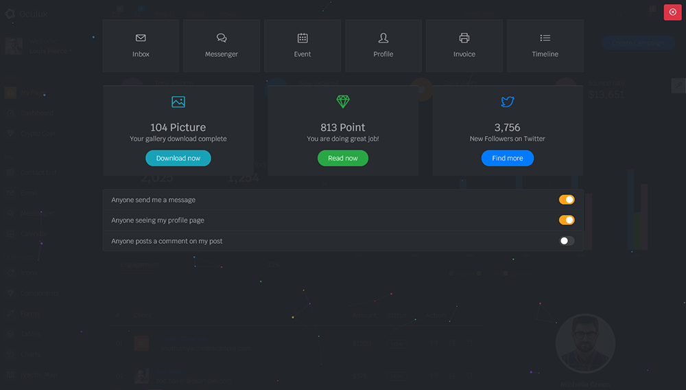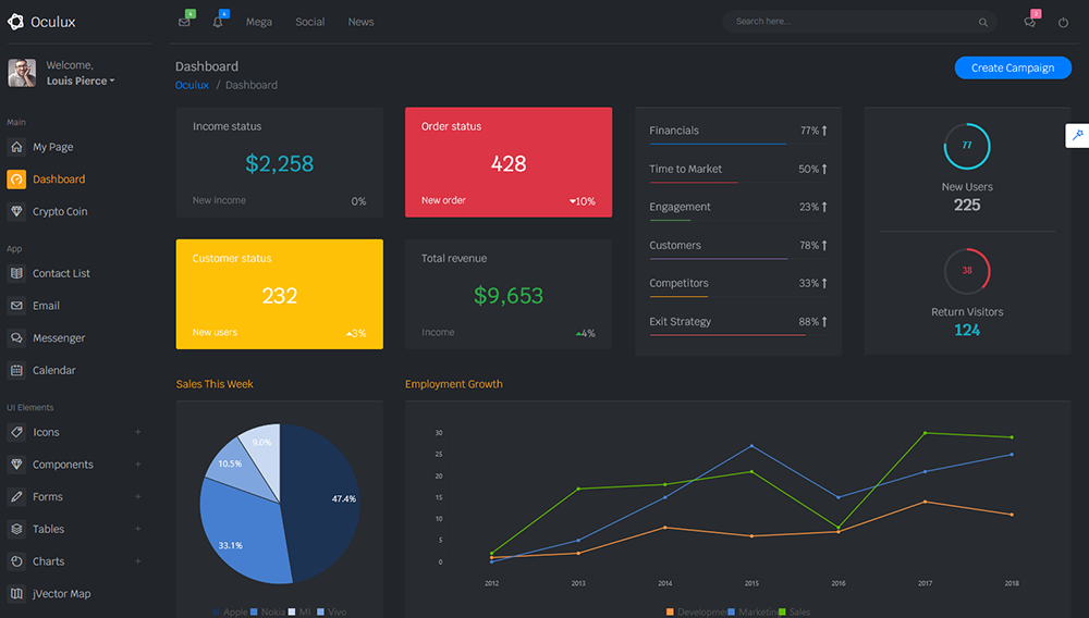 Oculux is a popular open source WebApp template for admin dashboards and admin panels. It’s responsive HTML template, which is based on the Bootstrap 4X framework. It utilizes all of the Bootstrap components in design and re-styles many commonly used plugins to create a consistent design that can be used as a user interface for backend applications.