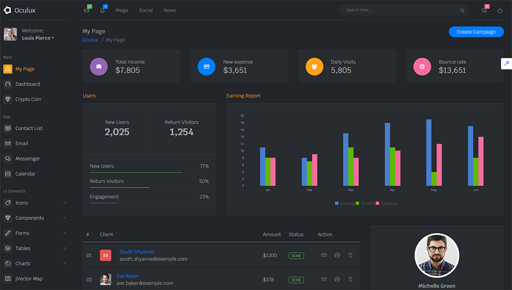 Oculux is a popular open source WebApp template for admin dashboards and admin panels. It’s responsive HTML template, which is based on the Bootstrap 4X framework. It utilizes all of the Bootstrap components in design and re-styles many commonly used plugins to create a consistent design that can be used as a user interface for backend applications.